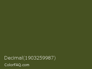 Decimal 1903259987 Color is a very dark lime color and the nearest color is Army Green #4b5320. Hex code #465121 and RGB value is rgb(70,81,33). In RGB color space, this color is composed of 27% red, 32% green, 13% blue, In CMYK color space, this color is composed of 14% cyan, 0% magenta, 59% yellow , 68% black , In HSL color space, this color has a hue angle of 74° , 42% saturation and 22% lightness.
