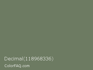 Decimal 118968336 Color is a normal green color and the nearest color is Limed Ash #747d63. Hex code #6d7b62 and RGB value is rgb(109,123,98). In RGB color space, this color is composed of 43% red, 48% green, 38% blue, In CMYK color space, this color is composed of 11% cyan, 0% magenta, 20% yellow , 52% black , In HSL color space, this color has a hue angle of 94° , 11% saturation and 43% lightness.
