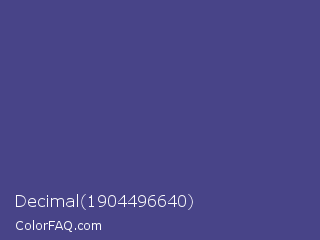 Decimal 1904496640 Color is a normal indigo color and the nearest color is Dark Slate Blue #483d8b. Hex code #484488 and RGB value is rgb(72,68,136). In RGB color space, this color is composed of 28% red, 27% green, 53% blue, In CMYK color space, this color is composed of 47% cyan, 50% magenta, 0% yellow , 47% black , In HSL color space, this color has a hue angle of 244° , 33% saturation and 40% lightness.