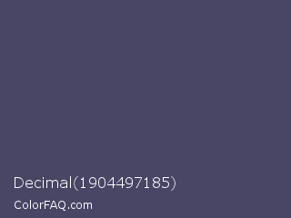 Decimal 1904497185 Color is a normal indigo color and the nearest color is Mulled Wine #4e4562. Hex code #484565 and RGB value is rgb(72,69,101). In RGB color space, this color is composed of 28% red, 27% green, 40% blue, In CMYK color space, this color is composed of 29% cyan, 32% magenta, 0% yellow , 60% black , In HSL color space, this color has a hue angle of 246° , 19% saturation and 33% lightness.