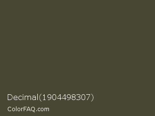 Decimal 1904498307 Color is a dark yellow color and the nearest color is Kelp #454936. Hex code #484733 and RGB value is rgb(72,71,51). In RGB color space, this color is composed of 28% red, 28% green, 20% blue, In CMYK color space, this color is composed of 0% cyan, 1% magenta, 29% yellow , 72% black , In HSL color space, this color has a hue angle of 57° , 17% saturation and 24% lightness.