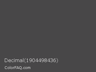 Decimal 1904498436 Color is a dark magenta color and the nearest color is Gravel #4a444b. Hex code #484748 and RGB value is rgb(72,71,72). In RGB color space, this color is composed of 28% red, 28% green, 28% blue, In CMYK color space, this color is composed of 0% cyan, 1% magenta, 0% yellow , 72% black , In HSL color space, this color has a hue angle of 300° , 1% saturation and 28% lightness.