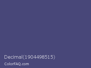 Decimal 1904498515 Color is a normal indigo color and the nearest color is East Bay #414c7d. Hex code #484779 and RGB value is rgb(72,71,121). In RGB color space, this color is composed of 28% red, 28% green, 47% blue, In CMYK color space, this color is composed of 40% cyan, 41% magenta, 0% yellow , 53% black , In HSL color space, this color has a hue angle of 241° , 26% saturation and 38% lightness.
