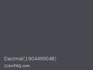 Decimal 1904499048 Color is a dark blue color and the nearest color is Mako #444954. Hex code #484850 and RGB value is rgb(72,72,80). In RGB color space, this color is composed of 28% red, 28% green, 31% blue, In CMYK color space, this color is composed of 10% cyan, 10% magenta, 0% yellow , 69% black , In HSL color space, this color has a hue angle of 240° , 5% saturation and 30% lightness.