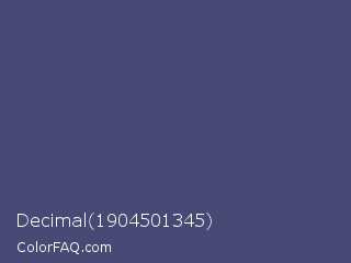 Decimal 1904501345 Color is a normal blue color and the nearest color is East Bay #414c7d. Hex code #484975 and RGB value is rgb(72,73,117). In RGB color space, this color is composed of 28% red, 29% green, 46% blue, In CMYK color space, this color is composed of 38% cyan, 38% magenta, 0% yellow , 54% black , In HSL color space, this color has a hue angle of 239° , 24% saturation and 37% lightness.
