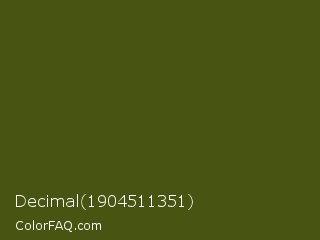 Decimal 1904511351 Color is a very dark lime color and the nearest color is Saratoga #555b10. Hex code #485411 and RGB value is rgb(72,84,17). In RGB color space, this color is composed of 28% red, 33% green, 7% blue, In CMYK color space, this color is composed of 14% cyan, 0% magenta, 80% yellow , 67% black , In HSL color space, this color has a hue angle of 71° , 66% saturation and 20% lightness.