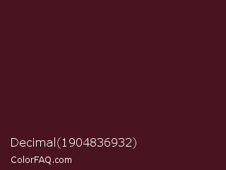 Decimal 1904836932 Color is a very dark red color and the nearest color is Cocoa Bean #481c1c. Hex code #491420 and RGB value is rgb(73,20,32). In RGB color space, this color is composed of 29% red, 8% green, 13% blue, In CMYK color space, this color is composed of 0% cyan, 73% magenta, 56% yellow , 71% black , In HSL color space, this color has a hue angle of 346° , 57% saturation and 18% lightness.