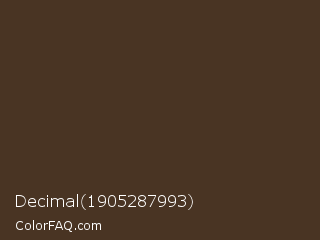 Decimal 1905287993 Color is a very dark orange color and the nearest color is Black Coffee #4b3621. Hex code #493423 and RGB value is rgb(73,52,35). In RGB color space, this color is composed of 29% red, 20% green, 14% blue, In CMYK color space, this color is composed of 0% cyan, 29% magenta, 52% yellow , 71% black , In HSL color space, this color has a hue angle of 27° , 35% saturation and 21% lightness.
