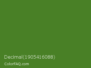 Decimal 1905416088 Color is a normal green color and the nearest color is Sap Green #507d2a. Hex code #498026 and RGB value is rgb(73,128,38). In RGB color space, this color is composed of 29% red, 50% green, 15% blue, In CMYK color space, this color is composed of 43% cyan, 0% magenta, 70% yellow , 50% black , In HSL color space, this color has a hue angle of 97° , 54% saturation and 33% lightness.