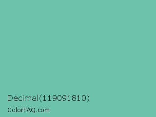 Decimal 119091810 Color is a normal cyan color and the nearest color is Tradewind #5fb3ac. Hex code #6dc2ae and RGB value is rgb(109,194,174). In RGB color space, this color is composed of 43% red, 76% green, 68% blue, In CMYK color space, this color is composed of 44% cyan, 0% magenta, 10% yellow , 24% black , In HSL color space, this color has a hue angle of 166° , 41% saturation and 59% lightness.