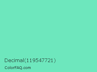Decimal 119547721 Color is a light green color and the nearest color is Medium Aquamarine #66ddaa. Hex code #6de7bd and RGB value is rgb(109,231,189). In RGB color space, this color is composed of 43% red, 91% green, 74% blue, In CMYK color space, this color is composed of 53% cyan, 0% magenta, 18% yellow , 9% black , In HSL color space, this color has a hue angle of 159° , 72% saturation and 67% lightness.