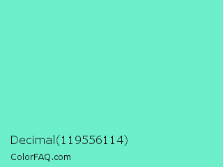 Decimal 119556114 Color is a light cyan color and the nearest color is Aquamarine #7fffd4. Hex code #6defcc and RGB value is rgb(109,239,204). In RGB color space, this color is composed of 43% red, 94% green, 80% blue, In CMYK color space, this color is composed of 54% cyan, 0% magenta, 15% yellow , 6% black , In HSL color space, this color has a hue angle of 164° , 80% saturation and 68% lightness.