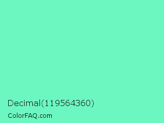Decimal 119564360 Color is a light green color and the nearest color is Aquamarine #7fffd4. Hex code #6df7c0 and RGB value is rgb(109,247,192). In RGB color space, this color is composed of 43% red, 97% green, 75% blue, In CMYK color space, this color is composed of 56% cyan, 0% magenta, 22% yellow , 3% black , In HSL color space, this color has a hue angle of 156° , 90% saturation and 70% lightness.