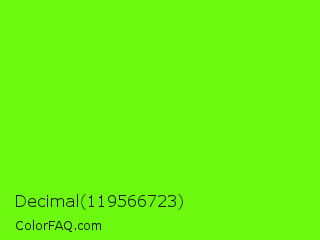 Decimal 119566723 Color is a normal green color and the nearest color is Bright Green #66ff00. Hex code #6df90f and RGB value is rgb(109,249,15). In RGB color space, this color is composed of 43% red, 98% green, 6% blue, In CMYK color space, this color is composed of 56% cyan, 0% magenta, 94% yellow , 2% black , In HSL color space, this color has a hue angle of 96° , 95% saturation and 52% lightness.