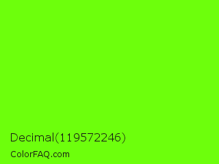 Decimal 119572246 Color is a normal green color and the nearest color is Bright Green #66ff00. Hex code #6dff0c and RGB value is rgb(109,255,12). In RGB color space, this color is composed of 43% red, 100% green, 5% blue, In CMYK color space, this color is composed of 57% cyan, 0% magenta, 95% yellow , 0% black , In HSL color space, this color has a hue angle of 96° , 100% saturation and 52% lightness.