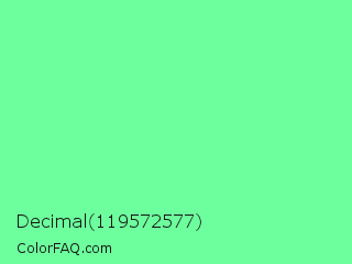 Decimal 119572577 Color is a light green color and the nearest color is Very Light Malachite Green #64e986. Hex code #6dff9d and RGB value is rgb(109,255,157). In RGB color space, this color is composed of 43% red, 100% green, 62% blue, In CMYK color space, this color is composed of 57% cyan, 0% magenta, 38% yellow , 0% black , In HSL color space, this color has a hue angle of 140° , 100% saturation and 71% lightness.