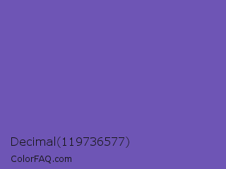 Decimal 119736577 Color is a normal indigo color and the nearest color is Blue Violet #6456b7. Hex code #6e55b5 and RGB value is rgb(110,85,181). In RGB color space, this color is composed of 43% red, 33% green, 71% blue, In CMYK color space, this color is composed of 39% cyan, 53% magenta, 0% yellow , 29% black , In HSL color space, this color has a hue angle of 256° , 39% saturation and 52% lightness.