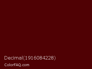 Decimal 1916084228 Color is a very dark red color and the nearest color is Mahogany #4e0606. Hex code #500104 and RGB value is rgb(80,1,4). In RGB color space, this color is composed of 31% red, 0% green, 2% blue, In CMYK color space, this color is composed of 0% cyan, 99% magenta, 95% yellow , 69% black , In HSL color space, this color has a hue angle of 358° , 98% saturation and 16% lightness.