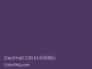 Decimal 1916163686 Color is a dark purple color and the nearest color is English Violet #563c5c. Hex code #503662 and RGB value is rgb(80,54,98). In RGB color space, this color is composed of 31% red, 21% green, 38% blue, In CMYK color space, this color is composed of 18% cyan, 45% magenta, 0% yellow , 62% black , In HSL color space, this color has a hue angle of 275° , 29% saturation and 30% lightness.