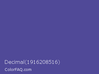 Decimal 1916208516 Color is a normal indigo color and the nearest color is Victoria #534491. Hex code #504998 and RGB value is rgb(80,73,152). In RGB color space, this color is composed of 31% red, 29% green, 60% blue, In CMYK color space, this color is composed of 47% cyan, 52% magenta, 0% yellow , 40% black , In HSL color space, this color has a hue angle of 245° , 35% saturation and 44% lightness.