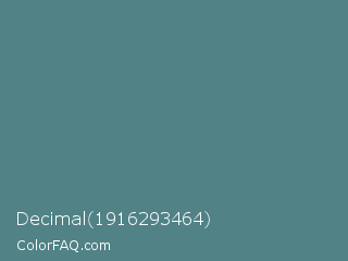 Decimal 1916293464 Color is a normal cyan color and the nearest color is Smalt Blue #51808f. Hex code #508286 and RGB value is rgb(80,130,134). In RGB color space, this color is composed of 31% red, 51% green, 53% blue, In CMYK color space, this color is composed of 40% cyan, 3% magenta, 0% yellow , 47% black , In HSL color space, this color has a hue angle of 184° , 25% saturation and 42% lightness.