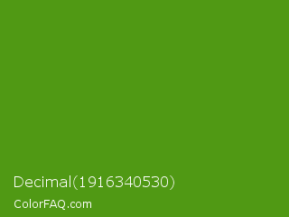 Decimal 1916340530 Color is a normal green color and the nearest color is Vida Loca #549019. Hex code #509914 and RGB value is rgb(80,153,20). In RGB color space, this color is composed of 31% red, 60% green, 8% blue, In CMYK color space, this color is composed of 48% cyan, 0% magenta, 87% yellow , 40% black , In HSL color space, this color has a hue angle of 93° , 77% saturation and 34% lightness.