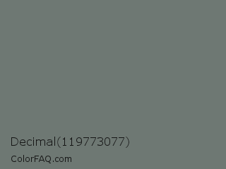 Decimal 119773077 Color is a normal green color and the nearest color is Nickel #727472. Hex code #6e7873 and RGB value is rgb(110,120,115). In RGB color space, this color is composed of 43% red, 47% green, 45% blue, In CMYK color space, this color is composed of 8% cyan, 0% magenta, 4% yellow , 53% black , In HSL color space, this color has a hue angle of 150° , 4% saturation and 45% lightness.