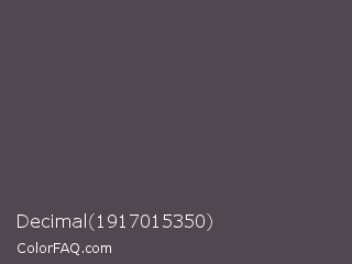 Decimal 1917015350 Color is a dark magenta color and the nearest color is Quartz #51484f. Hex code #514750 and RGB value is rgb(81,71,80). In RGB color space, this color is composed of 32% red, 28% green, 31% blue, In CMYK color space, this color is composed of 0% cyan, 12% magenta, 1% yellow , 68% black , In HSL color space, this color has a hue angle of 306° , 7% saturation and 30% lightness.