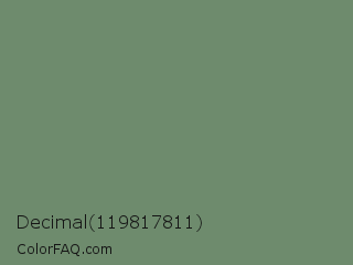 Decimal 119817811 Color is a normal green color and the nearest color is Highland #6f8e63. Hex code #6e8b6d and RGB value is rgb(110,139,109). In RGB color space, this color is composed of 43% red, 55% green, 43% blue, In CMYK color space, this color is composed of 21% cyan, 0% magenta, 22% yellow , 45% black , In HSL color space, this color has a hue angle of 118° , 12% saturation and 49% lightness.