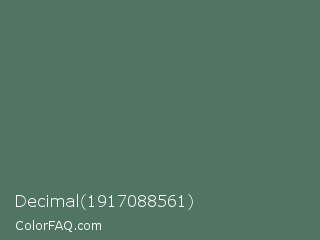 Decimal 1917088561 Color is a normal green color and the nearest color is Como #517c66. Hex code #517563 and RGB value is rgb(81,117,99). In RGB color space, this color is composed of 32% red, 46% green, 39% blue, In CMYK color space, this color is composed of 31% cyan, 0% magenta, 15% yellow , 54% black , In HSL color space, this color has a hue angle of 150° , 18% saturation and 39% lightness.