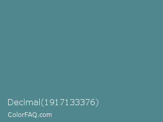 Decimal 1917133376 Color is a normal cyan color and the nearest color is Smalt Blue #51808f. Hex code #518890 and RGB value is rgb(81,136,144). In RGB color space, this color is composed of 32% red, 53% green, 56% blue, In CMYK color space, this color is composed of 44% cyan, 6% magenta, 0% yellow , 44% black , In HSL color space, this color has a hue angle of 188° , 28% saturation and 44% lightness.