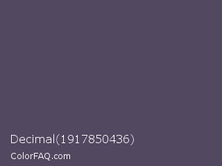 Decimal 1917850436 Color is a normal violet color and the nearest color is Mulled Wine #4e4562. Hex code #524860 and RGB value is rgb(82,72,96). In RGB color space, this color is composed of 32% red, 28% green, 38% blue, In CMYK color space, this color is composed of 15% cyan, 25% magenta, 0% yellow , 62% black , In HSL color space, this color has a hue angle of 265° , 14% saturation and 33% lightness.