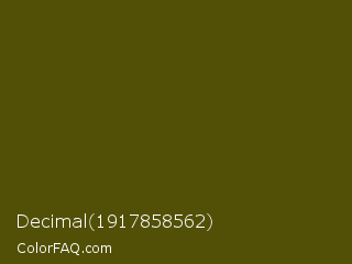 Decimal 1917858562 Color is a very dark yellow color and the nearest color is Verdun Green #495400. Hex code #525006 and RGB value is rgb(82,80,6). In RGB color space, this color is composed of 32% red, 31% green, 2% blue, In CMYK color space, this color is composed of 0% cyan, 2% magenta, 93% yellow , 68% black , In HSL color space, this color has a hue angle of 58° , 86% saturation and 17% lightness.