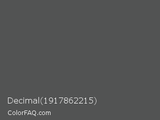 Decimal 1917862215 Color is a normal cyan color and the nearest color is Davys Grey #555555. Hex code #525353 and RGB value is rgb(82,83,83). In RGB color space, this color is composed of 32% red, 33% green, 33% blue, In CMYK color space, this color is composed of 1% cyan, 0% magenta, 0% yellow , 67% black , In HSL color space, this color has a hue angle of 180° , 1% saturation and 32% lightness.