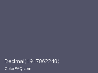 Decimal 1917862248 Color is a normal blue color and the nearest color is Independence #4c516d. Hex code #525368 and RGB value is rgb(82,83,104). In RGB color space, this color is composed of 32% red, 33% green, 41% blue, In CMYK color space, this color is composed of 21% cyan, 20% magenta, 0% yellow , 59% black , In HSL color space, this color has a hue angle of 237° , 12% saturation and 36% lightness.