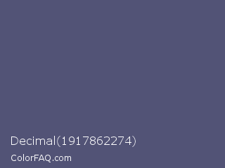 Decimal 1917862274 Color is a normal blue color and the nearest color is Purple Navy #4e5180. Hex code #525376 and RGB value is rgb(82,83,118). In RGB color space, this color is composed of 32% red, 33% green, 46% blue, In CMYK color space, this color is composed of 31% cyan, 30% magenta, 0% yellow , 54% black , In HSL color space, this color has a hue angle of 238° , 18% saturation and 39% lightness.