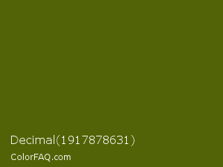 Decimal 1917878631 Color is a very dark lime color and the nearest color is Saratoga #555b10. Hex code #526307 and RGB value is rgb(82,99,7). In RGB color space, this color is composed of 32% red, 39% green, 3% blue, In CMYK color space, this color is composed of 17% cyan, 0% magenta, 93% yellow , 61% black , In HSL color space, this color has a hue angle of 71° , 87% saturation and 21% lightness.