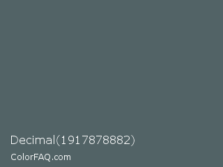 Decimal 1917878882 Color is a normal cyan color and the nearest color is Stormcloud #4f666a. Hex code #526366 and RGB value is rgb(82,99,102). In RGB color space, this color is composed of 32% red, 39% green, 40% blue, In CMYK color space, this color is composed of 20% cyan, 3% magenta, 0% yellow , 60% black , In HSL color space, this color has a hue angle of 189° , 11% saturation and 36% lightness.