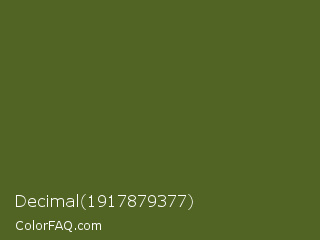 Decimal 1917879377 Color is a dark lime color and the nearest color is Dark Moss Green #4a5d23. Hex code #526423 and RGB value is rgb(82,100,35). In RGB color space, this color is composed of 32% red, 39% green, 14% blue, In CMYK color space, this color is composed of 18% cyan, 0% magenta, 65% yellow , 61% black , In HSL color space, this color has a hue angle of 77° , 48% saturation and 26% lightness.