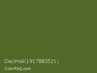 Decimal 1917883521 Color is a dark green color and the nearest color is Dark Olive Green #556b2f. Hex code #526829 and RGB value is rgb(82,104,41). In RGB color space, this color is composed of 32% red, 41% green, 16% blue, In CMYK color space, this color is composed of 21% cyan, 0% magenta, 61% yellow , 59% black , In HSL color space, this color has a hue angle of 81° , 43% saturation and 28% lightness.