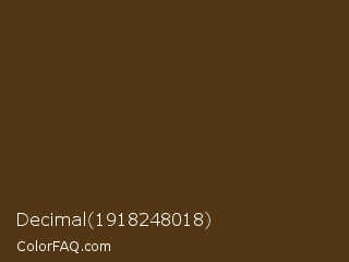 Decimal 1918248018 Color is a very dark orange color and the nearest color is Punga #4d3d14. Hex code #533714 and RGB value is rgb(83,55,20). In RGB color space, this color is composed of 33% red, 22% green, 8% blue, In CMYK color space, this color is composed of 0% cyan, 34% magenta, 76% yellow , 67% black , In HSL color space, this color has a hue angle of 33° , 61% saturation and 20% lightness.