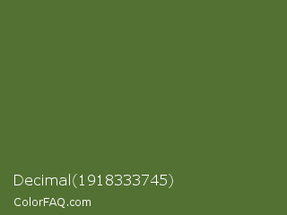Decimal 1918333745 Color is a normal green color and the nearest color is Dark Olive Green #556b2f. Hex code #537133 and RGB value is rgb(83,113,51). In RGB color space, this color is composed of 33% red, 44% green, 20% blue, In CMYK color space, this color is composed of 27% cyan, 0% magenta, 55% yellow , 56% black , In HSL color space, this color has a hue angle of 89° , 38% saturation and 32% lightness.