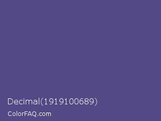 Decimal 1919100689 Color is a normal indigo color and the nearest color is Victoria #534491. Hex code #544987 and RGB value is rgb(84,73,135). In RGB color space, this color is composed of 33% red, 29% green, 53% blue, In CMYK color space, this color is composed of 38% cyan, 46% magenta, 0% yellow , 47% black , In HSL color space, this color has a hue angle of 251° , 30% saturation and 41% lightness.