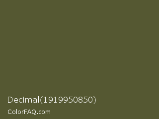 Decimal 1919950850 Color is a dark yellow color and the nearest color is Verdigris #5d5e37. Hex code #555832 and RGB value is rgb(85,88,50). In RGB color space, this color is composed of 33% red, 35% green, 20% blue, In CMYK color space, this color is composed of 3% cyan, 0% magenta, 43% yellow , 65% black , In HSL color space, this color has a hue angle of 65° , 28% saturation and 27% lightness.
