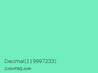 Decimal 119997233 Color is a light green color and the nearest color is Medium Aquamarine #66ddaa. Hex code #6eefbb and RGB value is rgb(110,239,187). In RGB color space, this color is composed of 43% red, 94% green, 73% blue, In CMYK color space, this color is composed of 54% cyan, 0% magenta, 22% yellow , 6% black , In HSL color space, this color has a hue angle of 156° , 80% saturation and 68% lightness.