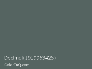 Decimal 1919963425 Color is a normal cyan color and the nearest color is Stormcloud #4f666a. Hex code #556461 and RGB value is rgb(85,100,97). In RGB color space, this color is composed of 33% red, 39% green, 38% blue, In CMYK color space, this color is composed of 15% cyan, 0% magenta, 3% yellow , 61% black , In HSL color space, this color has a hue angle of 168° , 8% saturation and 36% lightness.