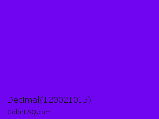 Decimal 120021015 Color is a normal violet color and the nearest color is Electric Indigo #6f00ff. Hex code #6f05f1 and RGB value is rgb(111,5,241). In RGB color space, this color is composed of 44% red, 2% green, 95% blue, In CMYK color space, this color is composed of 54% cyan, 98% magenta, 0% yellow , 5% black , In HSL color space, this color has a hue angle of 267° , 96% saturation and 48% lightness.