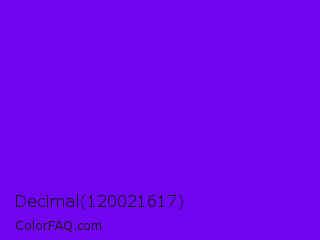Decimal 120021617 Color is a normal violet color and the nearest color is Electric Indigo #6f00ff. Hex code #6f06ef and RGB value is rgb(111,6,239). In RGB color space, this color is composed of 44% red, 2% green, 94% blue, In CMYK color space, this color is composed of 54% cyan, 97% magenta, 0% yellow , 6% black , In HSL color space, this color has a hue angle of 267° , 95% saturation and 48% lightness.