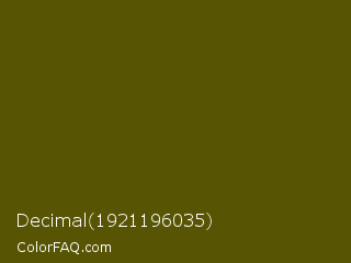 Decimal 1921196035 Color is a very dark yellow color and the nearest color is Verdun Green #495400. Hex code #575403 and RGB value is rgb(87,84,3). In RGB color space, this color is composed of 34% red, 33% green, 1% blue, In CMYK color space, this color is composed of 0% cyan, 3% magenta, 97% yellow , 66% black , In HSL color space, this color has a hue angle of 58° , 93% saturation and 18% lightness.