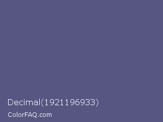 Decimal 1921196933 Color is a normal indigo color and the nearest color is Purple Navy #4e5180. Hex code #575581 and RGB value is rgb(87,85,129). In RGB color space, this color is composed of 34% red, 33% green, 51% blue, In CMYK color space, this color is composed of 33% cyan, 34% magenta, 0% yellow , 49% black , In HSL color space, this color has a hue angle of 243° , 21% saturation and 42% lightness.